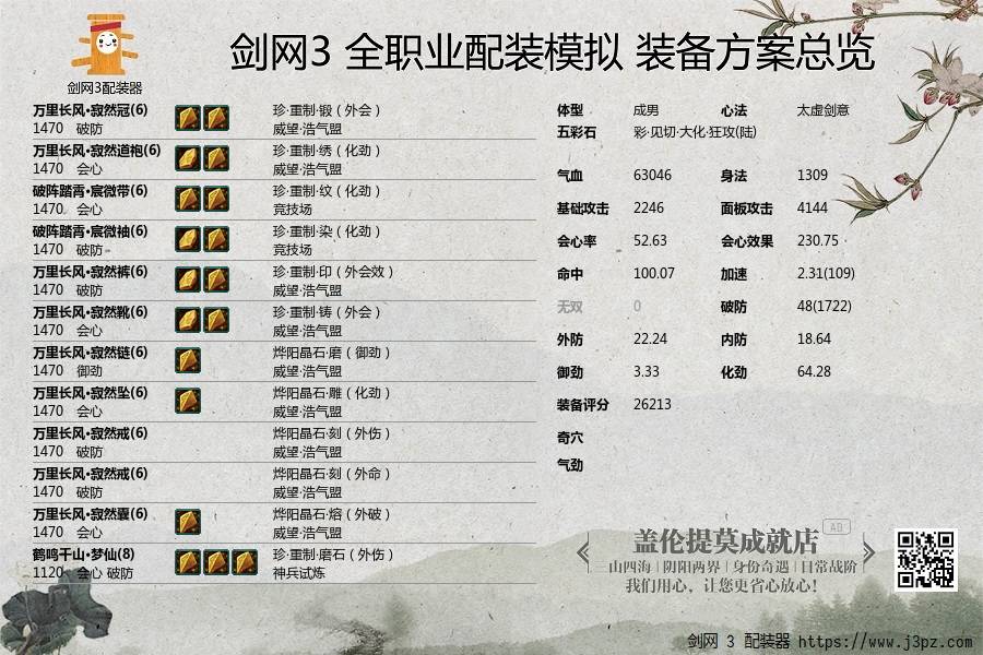 阿胎的配装呢,哦,不,剑纯的配装呢还是以一个高会心为主的,毕竟纯阳门下第一剑法太虚剑意,所谓太虚了,咱们剑小纯就自我补补,所以我们要走一个高御化剑纯,麻麻再也不用担心我回不去了,所以小伙伴们注意了,重点哦。剑纯虽然走的一段加速,但是我们并没有把项链换上命中的,而是换上了御化的,不单单是项链哦,五彩石第二属性也是化劲的,不单单这样哦,护手附魔也是化劲的,裤子最后忍了忍还是选择带上会效。小贼儿,知道我是什么吗?一个移动的输出堡垒!哼哼,你打不动我,但我能打洗你!