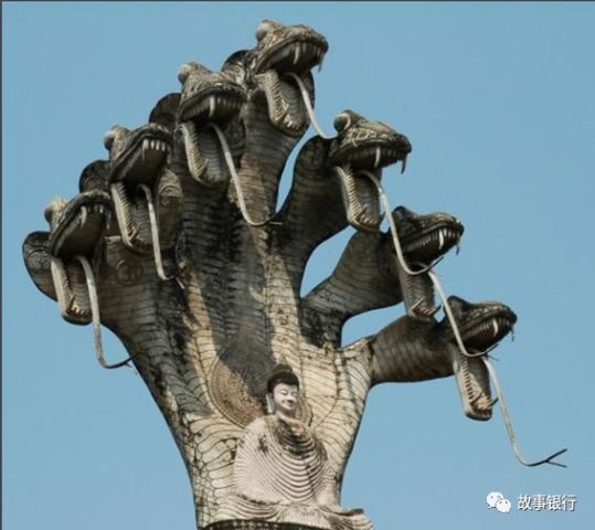 那伽在佛教中的形象通常是上边身是人,下半身是蛇,通常还在背上负着5到7只蛇,形象十分的狰狞恐怖。