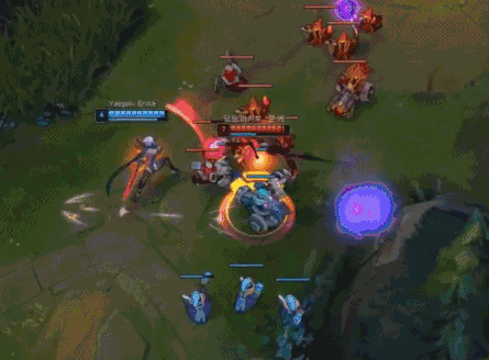 后期单带推塔,青钢影的Q推塔速度非常快,一旦有人来收线,除了武器、剑姬这类型的单挑战士都可以直接E脸击杀,来的人太多要么跑,要么用大招、秒表来拖时间让队友推塔拿龙。