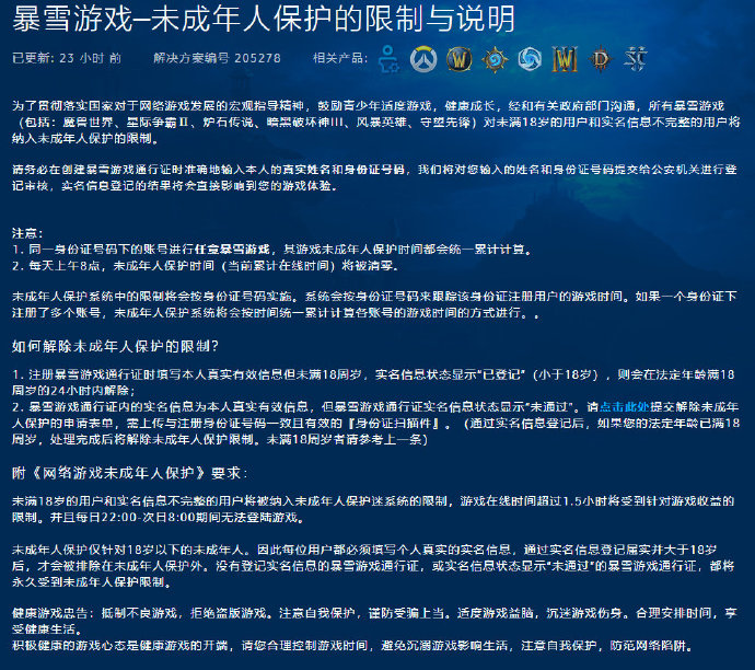 回过头来继续说暴雪的未成年人防沉迷措施吧。对于游戏防沉迷措施,玩家们应对的手段也有很多,除了冒用身份证信息外,还有的会选择同时经营多个游戏产品,错开被限制的时间。但是在暴雪全家桶里,这一招却并没有后门给你用。在相关说明里,暴雪官方表示同一身份证下的账号,进行任意暴雪游戏,其未成年人的保护时间都会统一累计计算!防沉迷的时间会在每天早上8点清零再重新结算。