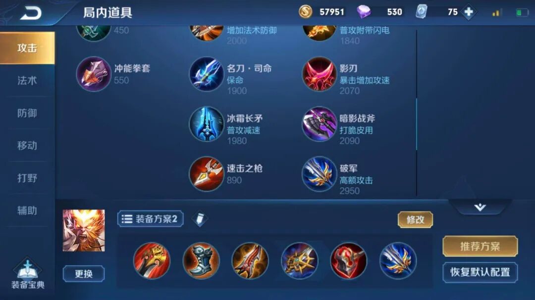 装备推荐如上图,打野刀攻速鞋无尽 宗师碎星锤 破军