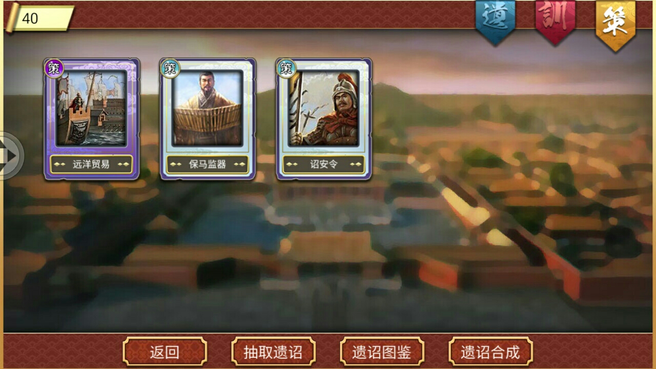 如果你是新玩家,那么完全可以通过这三个卡片来“逆天改命”皇帝攻略计划,使游戏更加有趣起来。例如我是老玩家,就不再陈述太多了,我用了臣训卡和国策卡,遗诏卡没用。(小声bb:毕竟遗诏卡好处和坏处难以权衡“易死”)