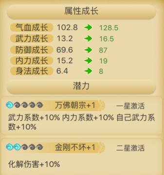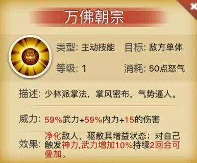 类型:主动技能 目标:敌方单体消耗:50点怒气威力:59%武力+59%内力+15伤害(初始)效果:净化敌人,驱散其增益状态;对自己触发神力,武力增加10%,持续2回合,可叠加(初始)。技能评价:金刚一掌,万佛朝宗,扫地僧的单体攻击技能,同时增加自身武力,但是这个技能最强力的地方,在于它会驱散被命中敌人的增益状态,这对目前主流的肉盾是非常大的克制,无论是铁头人的毒伤反制,还是飞狐大侠的神武状态,或者是黄蓉的增益状态,只要扫地僧一掌,都会被驱散的干干净净,金刚一掌,万法皆消。