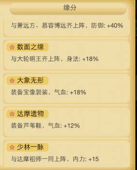 扫地僧,萧远方和慕容博远的组合比较少见,不过三个人一起,各自加成40%防御,想来也是不错的。在加个大轮明王和乔帮主,倒是可以重演小说中的经典一幕。物品缘方面:两件物品都是紫装,应该不难得到,两件装备都加成扫地僧的气血,提升扫地僧的生存能力。