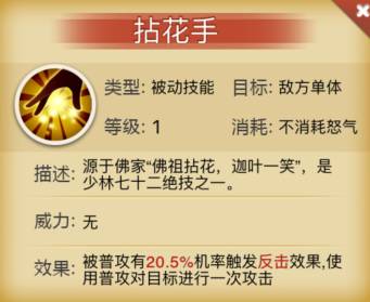 类型:被动技能 目标:敌方单体消耗:无威力:无效果:被普攻有20.5%机率触发反击效果,使用普攻对目标进行一次攻击。技能评价:防御型侠客常见技能,常见并不代表平庸,关键时刻,一个的反击可能会扭转战局,尤其是对于敌方脆皮的反击,如果脆皮已经受伤,扫地僧的反击有可能秒了对方,使战场的天平发生巨大倾斜。