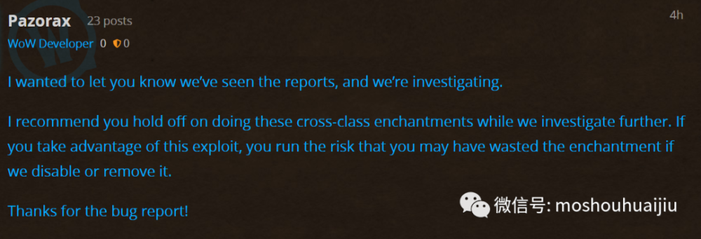 在我们进一步调查此问题期间,希望玩家不要利用此Bug跨职业交易祖格附魔。如果你们从滥用此机制中获益,就面临附魔被移除或禁用的风险。