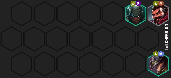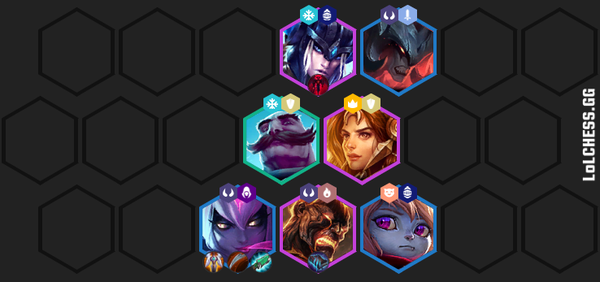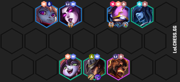 站位:凯南和莫甘娜作为核心输出,尽量往前站保证最佳的输出时间和输出位置。中间留出一个洞,一方面是防止海克斯同时屏蔽她们的装备。另外也是为了让小菊如果在凯南和冰女的后方召唤时,能有一个空位给小菊站上来抗伤害。