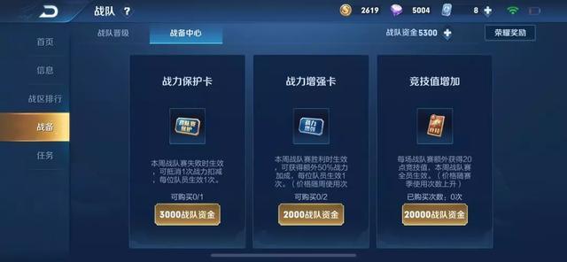 如果你的战队资金不足想冲排名的话,必买战力保护卡(每周购买1次)与战力增强卡(每周购买2次),竞技值增加卡不推荐购买;