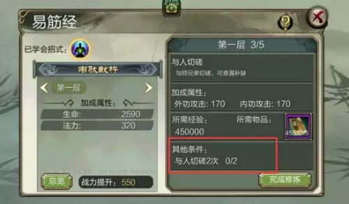 需要通过经验,《易筋经》残卷及完成特定任务才可进行修炼,每次修炼成功均可获得人物属性的增长。