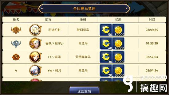 在挑战成功之后全民赛马攻略,系统将会根据小伙伴们的比赛名次发放不同等级的活动奖励,第一名可以获得丰厚的50龙币以及5W金币奖励,随着小伙伴们名次的降低,奖励道具也会有所减少。所以小伙伴们要想获得丰厚奖励的话就要在本玩法中多多加油了哦。
