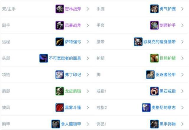 至此,我们不难发现,几乎是一到60级,狂暴战就可以把全身武装得七七八八。什么强击护肩、竞技场锁甲、血链锁甲鞋请暂且放过,何苦去与人争夺还要背上跨甲的骂名呢?接着就是重要的两把武器,这一点狂暴战跟战斗贼一模一样,可以选的单手剑不多,主手只有克罗一途,副手的选择就比较宽广,米拉、厄运长刀甚至半藏之剑都不错,兽人战士请选择密林战斧加风暴战斧。