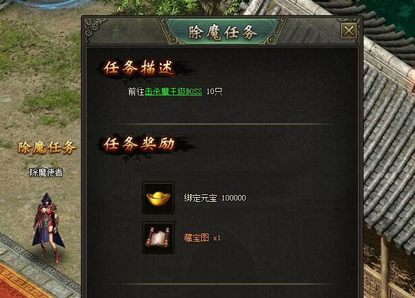 和除魔使者见面的主要目的当然不是唠嗑,而是任务和奖励,除魔任务提供的奖励有元宝和藏宝图,在此特别要说下藏宝图,在藏宝阁里使用可挖取稀有宝藏(当然也有可能挖出900级的大BOSS)!和小姐姐多多互动,接取任务,比赢大奖来得方便哦!