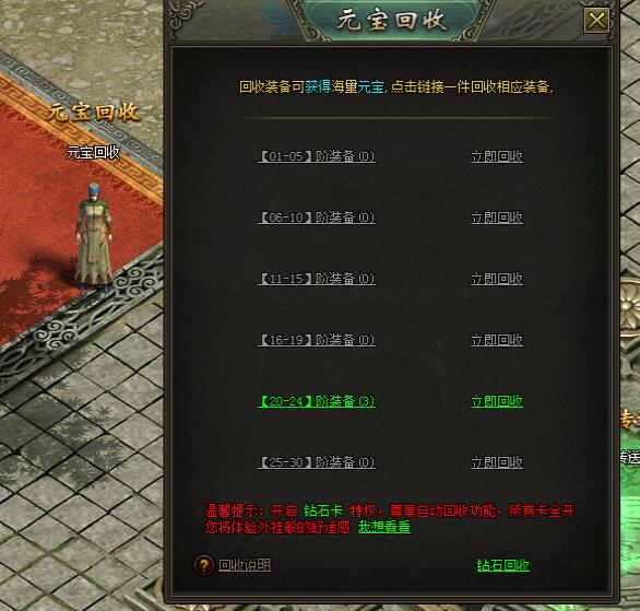 一听到“装备回收”,恐怕大伙儿第一时间想到的就是那句“装备回收秒到账”。创世大陆人气最高的“元宝回收”小哥可以帮你解决掉那些无用的装备,他的所在位置与治疗老人很近,在地图上没有明确显示出来,就是怕人太多才低调行事。找到他以后,可以将你背包里无用的低级装备统统回收,回收后会返还你丰厚的元宝,装备等级越高回收返还也就越多,拿上这些钱又可以尽情花啦!