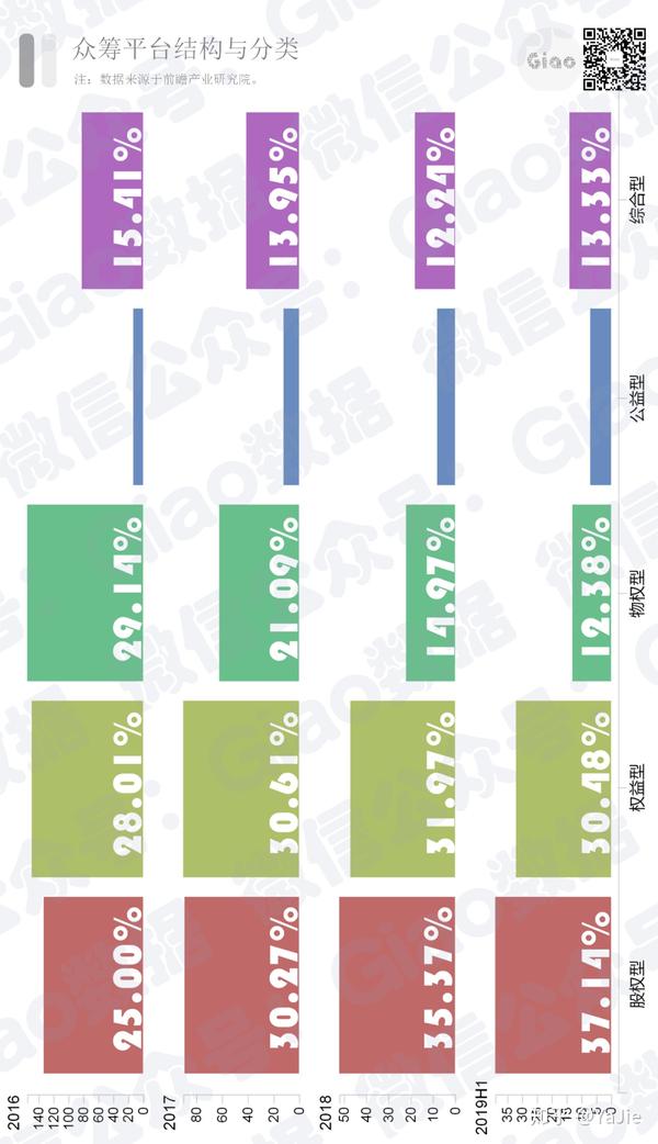 我们统计了2020-2019年期间五类众筹平台的占比情况(如下图)。