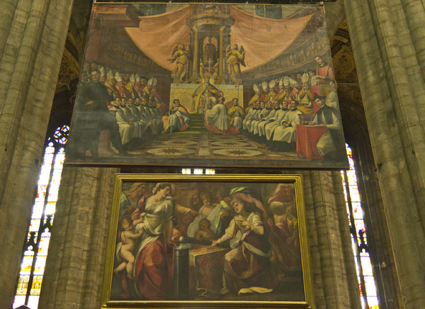 教堂两边悬挂着六幅巨型油画,《圣卡洛·博罗梅奥的生平》。