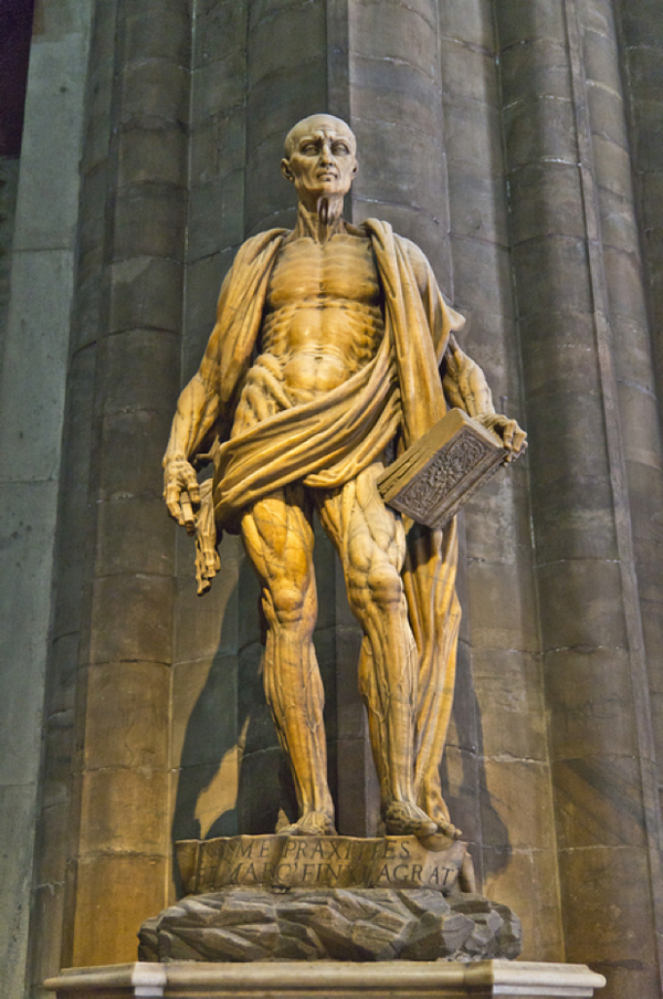 他是耶稣的十二门徒之一,圣.巴多罗买,耶稣升天后,他继续传教,在亚美尼亚被活生生剥去皮肤,所以他肩上批的不是长袍,而是他的人皮,左手还紧紧握着《圣经》。