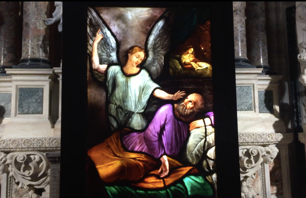 这是圣经新约故事,玛利亚未婚怀孕,老公约瑟夫怒了就想分手,天使走进约瑟夫梦里告诉他:你老婆怀的是耶稣……具体点是,放心娶回家,别怀疑你老婆,孩子来自圣灵,起名叫耶稣。