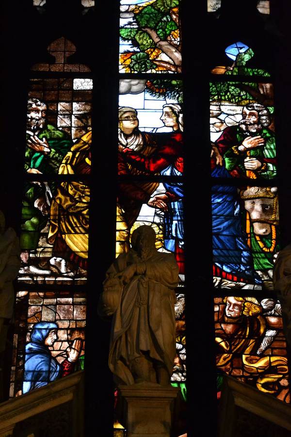 每一扇玻璃窗都有30多个画面,都绘制着圣经故事。其实这么做是有道理的,教会总说天堂美好地狱可怕,但光说是不够的,必须建成线下体验店(我实在找不出更好的比喻,原谅我……),信徒一进来就感受到这种神秘、美好或是恐惧。回到那个时代,设想下文盲们走近来的感觉?一定是更加相信教会的理论,因为有时候真正的信仰和真正的恐惧是分不清的。