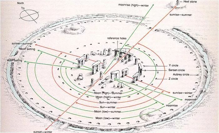 巨石阵的主轴线和通往石柱的古道, 与夏至日早晨初升的太阳在同一条线上; 另外, 其中还有两块石头的连线指向冬至日落的方向.