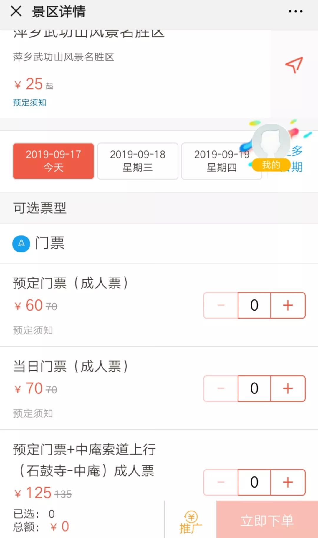 ②可在“以武慧游”后台购买门票和索道票,在公众号提前一天以上购买门票只要60元/人