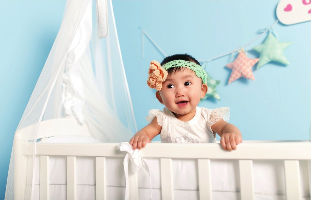 把宝宝放在婴儿床里,然后宝爸在摄影师旁边做出各种搞笑的