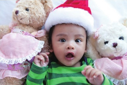可以让宝妈或是宝宝喜欢的人躲在摄影师后面,也可以用双手捂住自己的脸,然后对宝宝进行藏猫猫的游戏,在出现的时候嘴上要配合着说“闷儿”,这样效果会非常好。