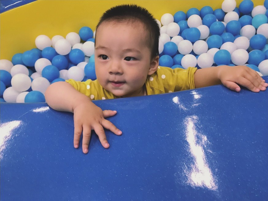 带小宝宝到游乐园里玩耍,将其放在小球池里