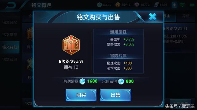 2、绿色铭文选择10个鹰眼,+64物理穿透;增加物理穿透,提高游戏初期的伤害,这是唯一的选择。