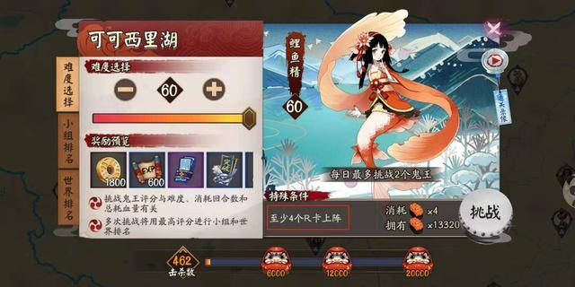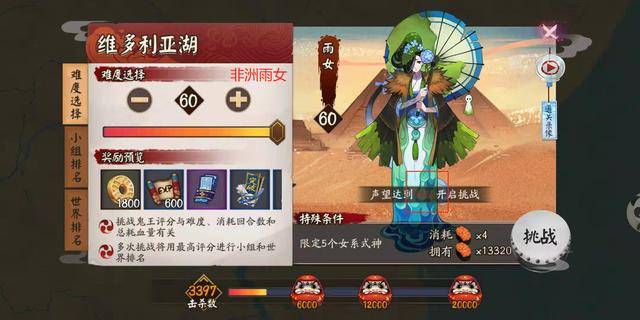 在你挑战地域鬼王的时候,会有1~60级的难度选择,如果要冲击排名,首选60级难度。虽然说积分是你的伤害和难度算比例的,也有可能在40级难度打出快速且伤害爆炸的效果,但是这样操作的难度似乎更大了,还是选择60级难度去攻略较稳一些。每天第一次挑战是消耗1点体力,第二次是2点体力,逐次增加,上限是6点体力。