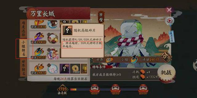 挑战过后会有一个即时的世界排名和小组排名,小组排名就是你所在的区挑战该鬼王的玩家积分排名,两个积分榜都是有奖励的,根据你的排名区间,会得到相应的高级御魂、稀有式神碎片等奖励,这里也是一个得到稀有式神碗的地方啊。就算是世界名次冲不了太靠前,在自己服务器还是可以挣一下的。