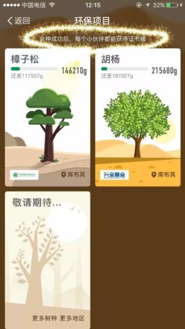 而很多人却没有意识到这个模式的真正意义。就以我自己开的两个合种为例。其中一个合种已经满了60人,每人每天最多可以浇水500g。所以只要大家共同协作,很快就可以种下200多千克的胡杨树。而且每个人都可以拿到胡杨树的证书。而那些没有浇过水的好友就无法获得这个证书。