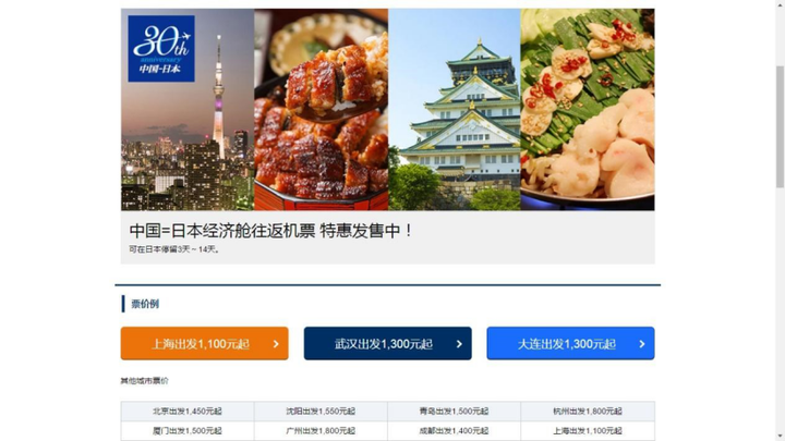 有些航司成立或者某航线开航的周年纪念日,航司也会推出特别的促销。这一类型的促销很适合没有明确目的地的旅行,定下大致的旅行时间段,哪里的机票价格合适就去哪里的宝宝。比如最近全日空正在中国区域推出的中国航线通航 30 周年机票特惠,放出的价格也很是让人心动: