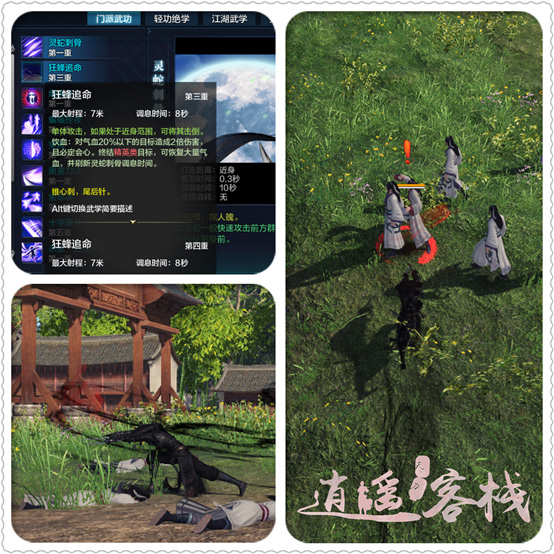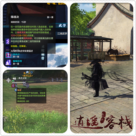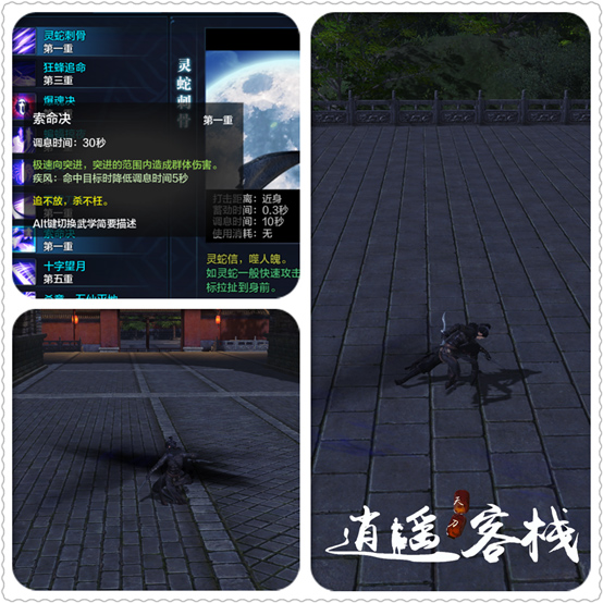 伤害前置技能,释放时以自身4米范围内出现幻影,使用翻滚后可以保持幻影持续攻击,类似真武驱影。攻击到目标后,对方获得一个爆魂DEBUFF,此技能可以配合寄生诀及蜃意无双造成伤害及控制效果,我们一般夹在狂风追命击倒和灵蛇刺骨拉拽的控制中使用。