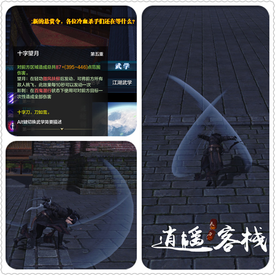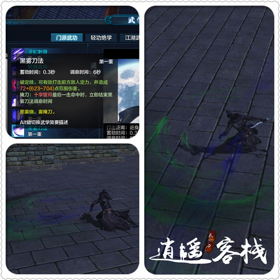 PVE中常用的输出技能,破定技的同时也是小位移技。五毒普攻十字望月三连中的第三段攻击到目标可以立刻刷新黑雾刀法CD,所以在PVE中我们常用十字+后滚+黑雾来打出范围伤害,这样会比转视角更迅速更准确。PVP中因为技能后摇过长必须配合翻滚取消后摇,避免被敌人抓到破绽。并且,它配合被动也可以完成二次突进。