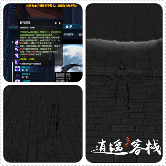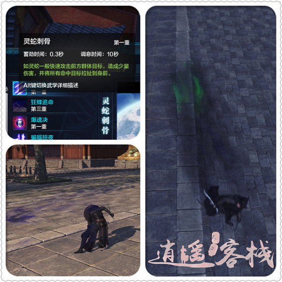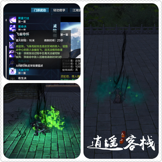 被动技能,五毒玩法的精髓。在技能命中目标后翻滚不消耗内息,并强化为瞬移效果。此效果可以取消五毒大部分技能的动作后摇,被动没有内置CD,理论上配合普攻可以无限瞬移造成绕背效果,但对于手速的要求较高,且此玩法较克制近战的同时,近战门派大多有霸体或指向性硬控,所以很难实现。目前五毒的基础要求只是配合五毒六连凤凰决杀完成闪连。此被动是五毒的核心技能,具有极大的开发潜力。