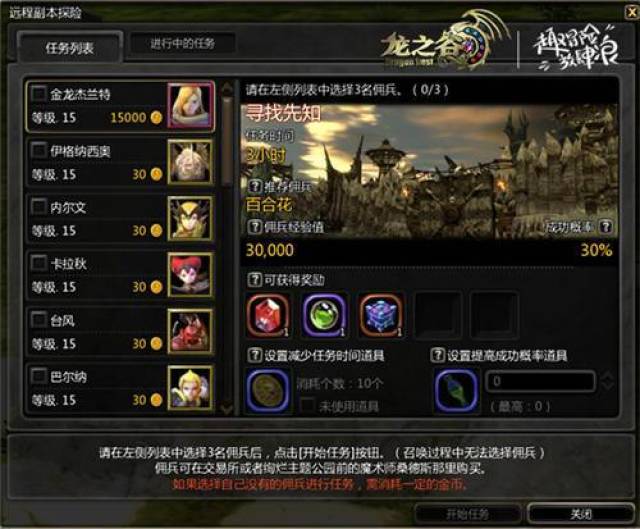 《龙之谷》中的远程佣兵任务算是内置的一款非常轻松安逸的放置类小游戏,派遣各等级的佣兵进行各类任务,就可以收获各种各样不同道具的惊喜。在今日更新后,新增2项L级佣兵远程副本探险任务,派遣列表内的“金龙杰兰特”上阵就能大幅提高成功率。奖励当然也特别丰厚,完成收集6个无限之石任务后,有机会从获得的探险箱内开启到95L龙玉,完成消灭咆哮的透明龙后,有机会从探险箱内开到带有最终属性的95A纹章。到底谁会欧气满满呢?