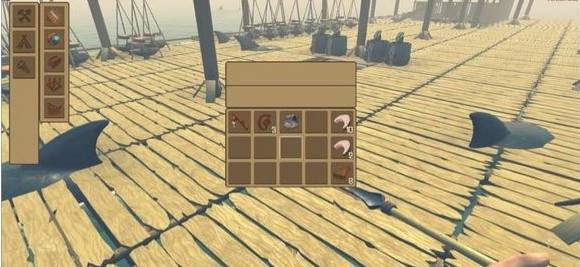 接着就是比较重要的东西了,我们利用我们打猎获得的肉做成鲨鱼饵,这时候我们尽量多做一些,因为鲨鱼饵不仅可以吸引鲨鱼,还可以使鲨鱼不攻击我们的竹筏。