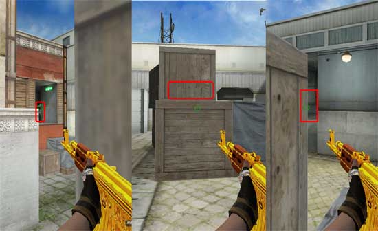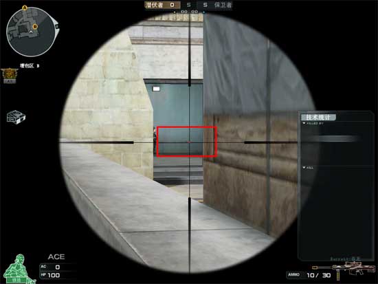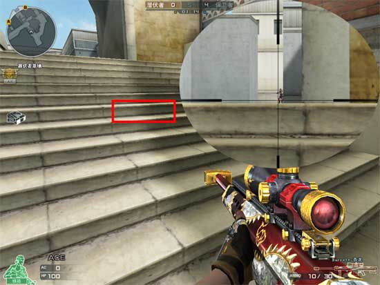 其实现在中路直接对狙是不太常见了,但还是简单提点一下。在图示的红框处,利用楼梯作为掩体蹲起来侦查中路敌人的狙击手,或者是有没有过点去A通的。蹲起时尽量要快,而且不要太规律的蹲起。在看到敌人的下一次利用蹲起打掉敌人,见好就收。