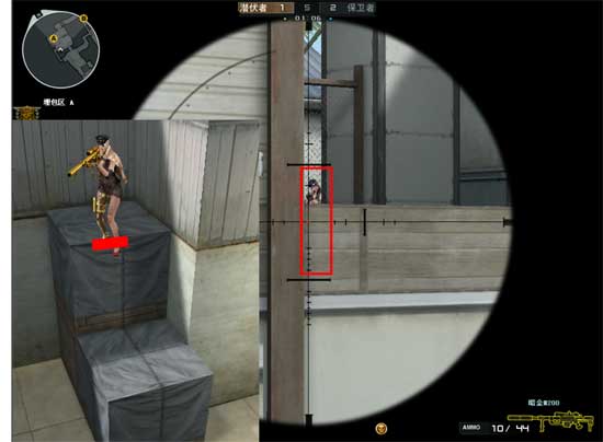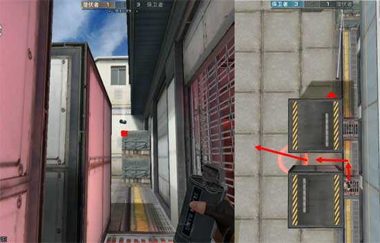 潜伏者要进攻A包点的话,会面对A正门、A小道和A通敌人的三路的夹击。所以要利用好A门外的组合箱这个掩体,这是帮助我们打开突破口的一个点位。向上图在组合箱上卡点,灵活的上下左右变点去侦查和打击A通和A小的敌人。同时还可以对A大进行道具投掷,配合进攻A大的队友进行突破。