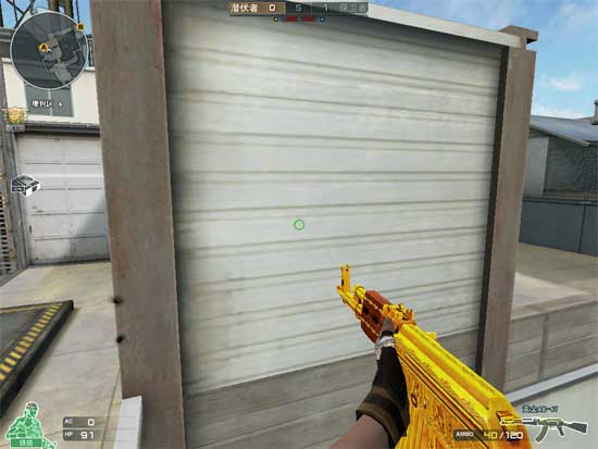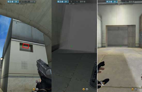 当成功突破A包点后并下包后,可以在图示的点位阴点,同时也是一个补枪位。这个位置不会被A后门打回防的敌人穿到的,前面的挡板是无法穿破的。在队友牵制A后门回防的敌人时,就要找准时机拉出去补枪。当然这个点位是在确定保卫者都是在A小回防时利用的,如果不确定,还是要小心A正门的敌人的。