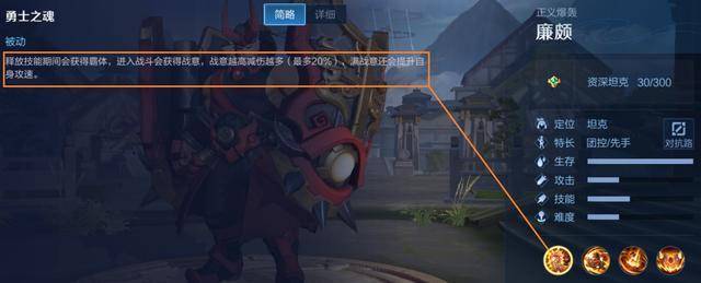 廉颇释放技能过程中会处于霸体状态。进入战斗后廉颇的战意会逐渐提升,战意越高减伤越多,且减伤有上限。当战意充盈时,廉颇提升自身攻击速度。脱战后战意逐渐降低。