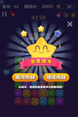 此时有个小tip是尽量使用点击两次消除,因为点击第一次可以看到所选星星获得的分数。消除的同时尽量多的积攒同一个颜色的星星,当所获分数距离目标分数比较接近时,点击积攒的同色星星全部消除,此时可以轻松获得三星。
