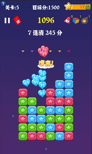 在第17、18关等关卡会出现消除星星自动左移的情况,尽可能多的消除左侧的星星,同时使用道具事半功倍消星星攻略,多多积攒同一个颜色的星星,当分数快接近目标分数时,点击消除积攒的同色星星,顺利得三星!