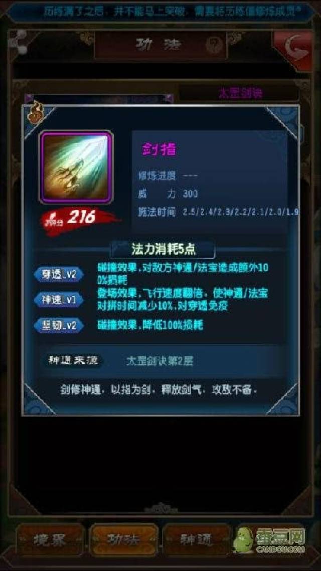 神通和法宝除了了威能(伤害值)以外,还有一到三个自带的技能,比如穿透(增加对敌方法宝和神通碰撞时的损害)。坚韧(减少碰撞损害),重塑(碰撞获胜可以回复法宝威力),等等,还有前面提到的污染,总之,这游戏的高玩思路就是物尽其用,法宝和神通,能让它的技能发挥最大的效果,你就玩好了游戏,比如污染,意思是碰撞对方法宝死了后自爆,结果你用来打脸,就亏了,打脸有猛击(碰撞敌方角色威能增加)呢,同样,你用带麻痹(命中地方角色使敌方麻痹一定时间)的法宝,跟对面的功法互相碰撞,也是亏,换成带有坚韧的神通就赚了。