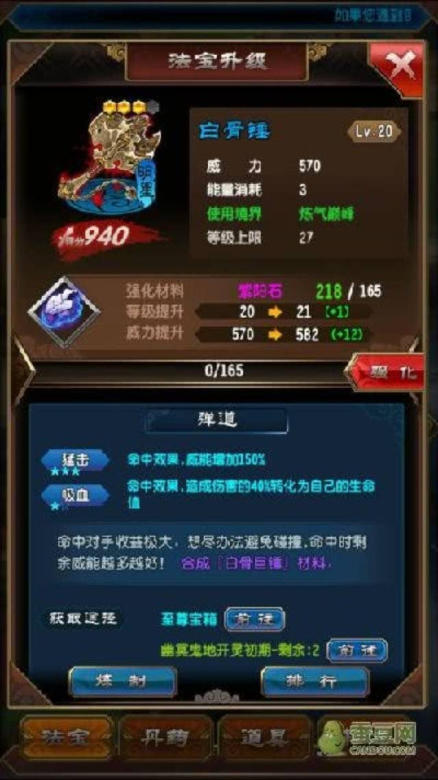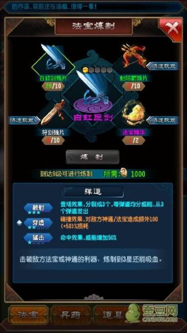射阳箭就是开灵期的,开灵期的法宝只有寥寥几件,所以,在开灵期,我们用500灵石就能大概率开出射阳,以及一些白虹剑碎片(白虹巨剑材料之一),当然,白骨巨锤所需要的三棱骨锥也可以顺便收集一点,接下来花钱没花钱的童鞋都做了新手任务有大量仙玉,稍微开一开其他箱子,搞强化石(青煞石,蓝耀石),将射阳和白虹剑升到满星,就搞定了,至于强(chong)化(de)石(qian)不够的,可以先升凝液,只要碎片够了就行,强化石慢慢来。