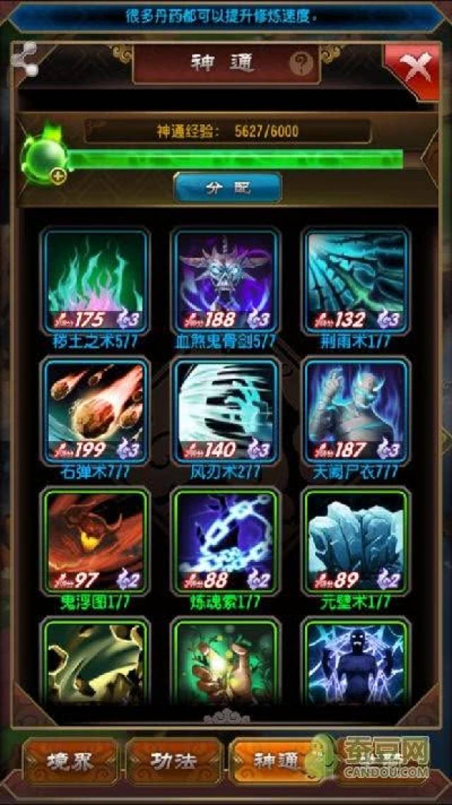 神通,可以通过神通经验升级(前期比较缺,中后期用不完,打怪可以获得,每天12-14点,19-21点打怪可以获得双倍神通经验),用神通经验升级神通的唯一作用就是减少CD,让它更快施法,所以神通看到好的必须马上换(最好带一个吸血的,或者墙,或者加盾的三选一)。开始玩就有的石弹术可以先升满,至少可以用两天。