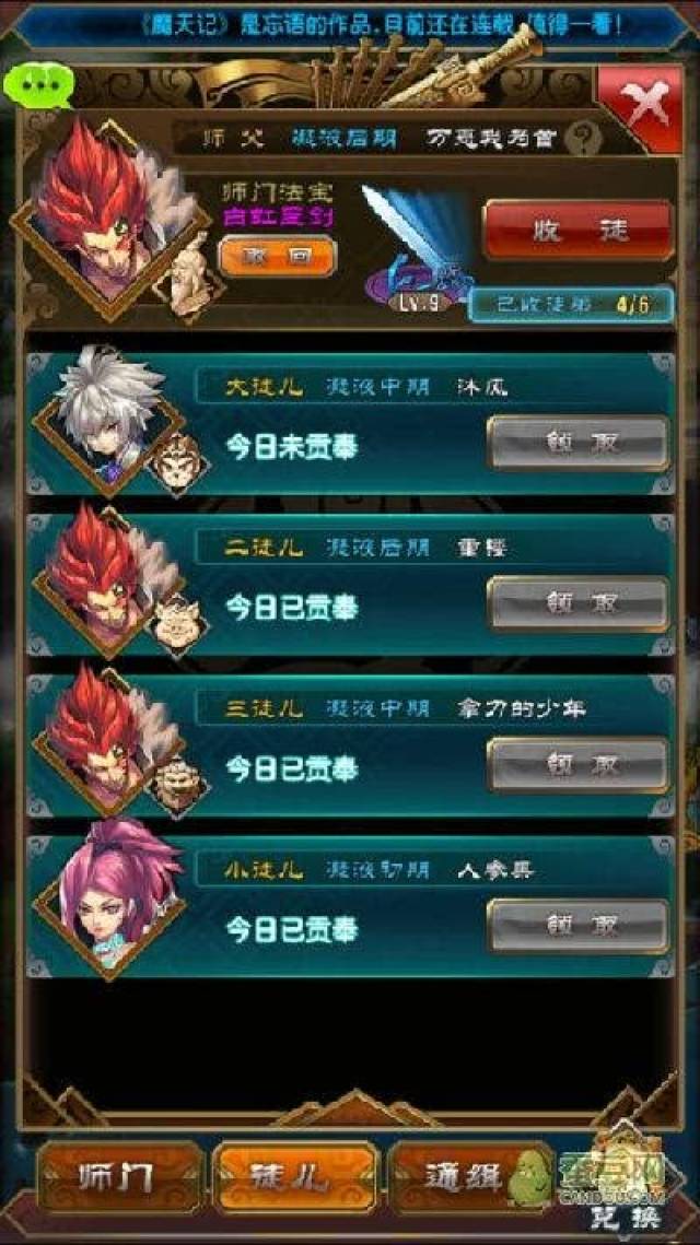 门有什么好处呢,首先大家都知道的有可以请师父或师兄出山(每天两次),帮你打某个怪(不需要对方在线)。还有每天你领每日任务的奖励(再读三遍这句话)对方可以领人气点(用来兑换道具),反之,对方领每日任务奖励你也有。