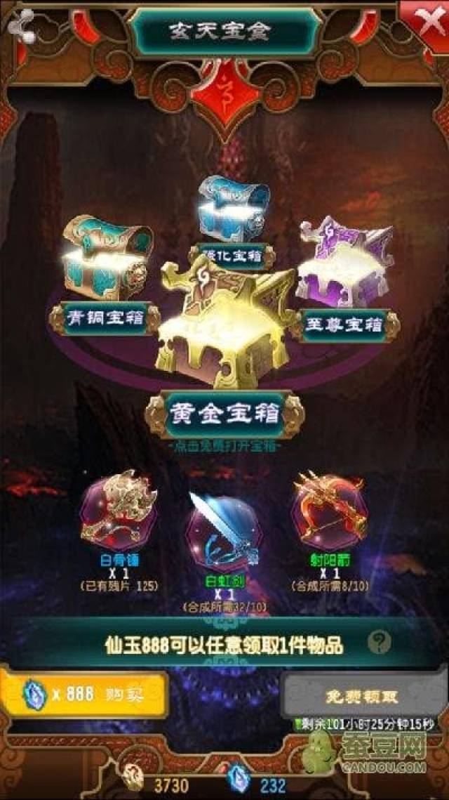接下来说游戏里的宝盒,这个玩(hua)法(qian)还算比较创新的,四种宝箱,青铜(开出法宝或者材料),黄金(出现整个法宝的几率很大),强化(主要是强化石,游戏里叫青煞石,蓝耀石,以及强化材料)至尊(充值任意金额可开启,大部分是法宝碎片,小概率出整个法宝),要注意,创新一点点的地方来了,这些宝箱都是可以免费开启的,开启后你可以看到3-6个选项,你可以从中任意选1-3件你想要的,选完再花仙玉或者灵石。或者你可以等8-100多个小时(依宝箱不同而定,时间单独计算)免费领取宝箱。