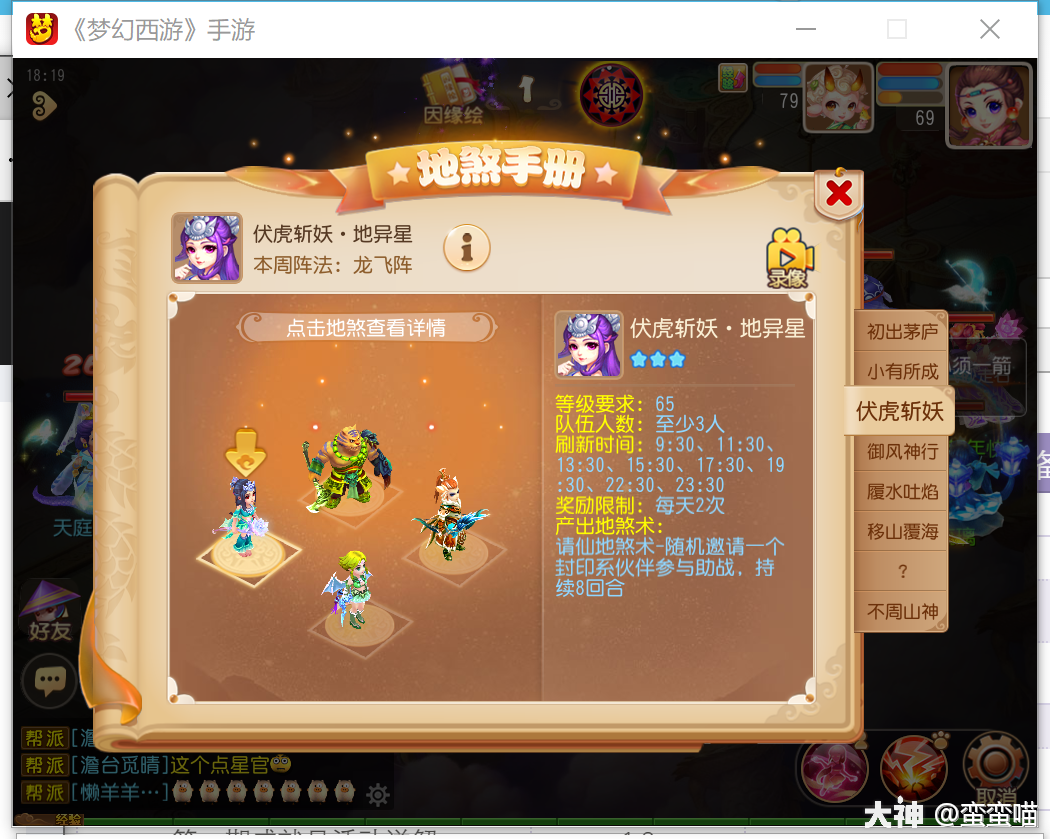 在活动 - 挑战活动的界面可以查看地煞的阵法和队长门派、时间
