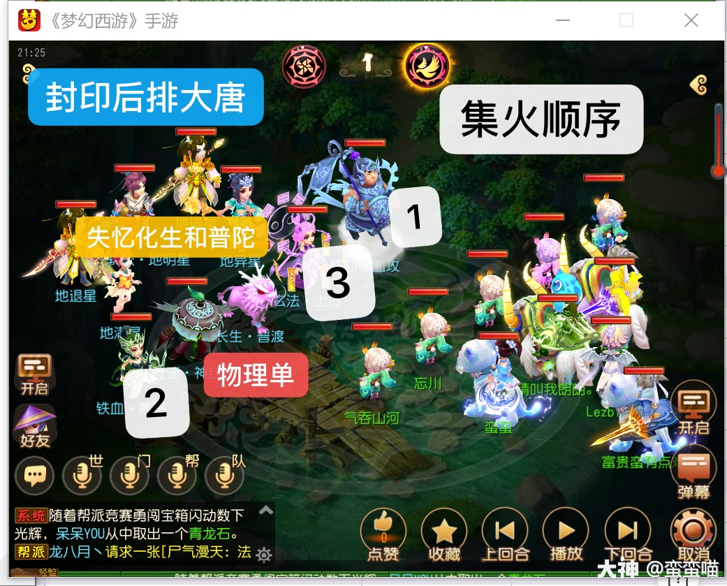第一回合一定要看好速度,自己是否比对面的狮驼、月宫、大唐快,如果是,优先扫他们,特别是大唐(如果对面大唐有翩鸿就别扫他了)。